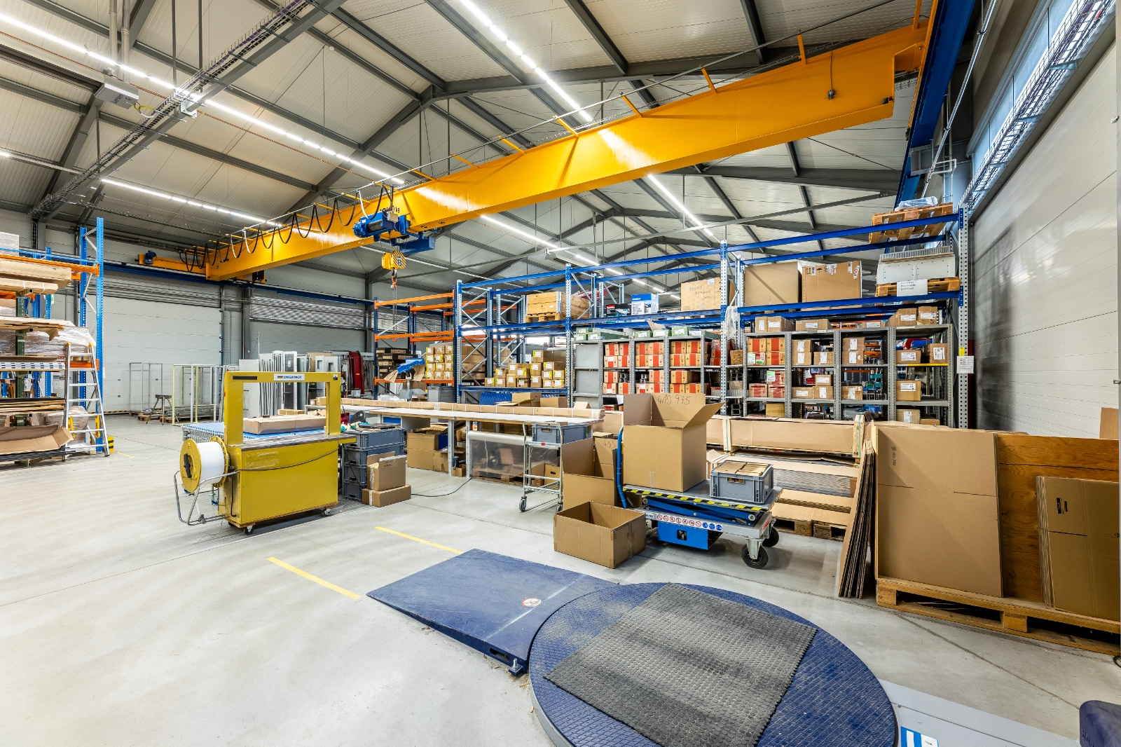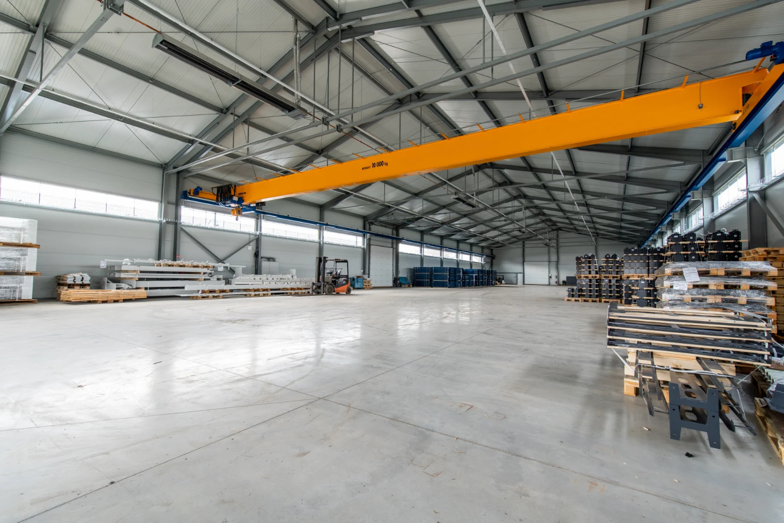 Objekt je připojen na elektřinu, plyn i vodovod. Hala je vytápěna plynovými zářiči a zateplena sendvičovým fasádním systémem (PIR panely). Osvětlení haly je umělé, se stropními svítidly s LED technologií, i přirozené, které je vytvořeno díky bočním světlíkům v podélných fasádách haly. Co se týče podlahových krytin, ve skladové části je průmyslový leštěný beton, v administrativní části je zátěžový koberec a sociální zařízení disponuje keramickou dlažbu. Objekt je vybaven sociálními zařízeními, koupelnami, šatnami pro muže a ženy a kuchyňským koutkem. Je zde portálový jeřáb s nosností 10 tun.